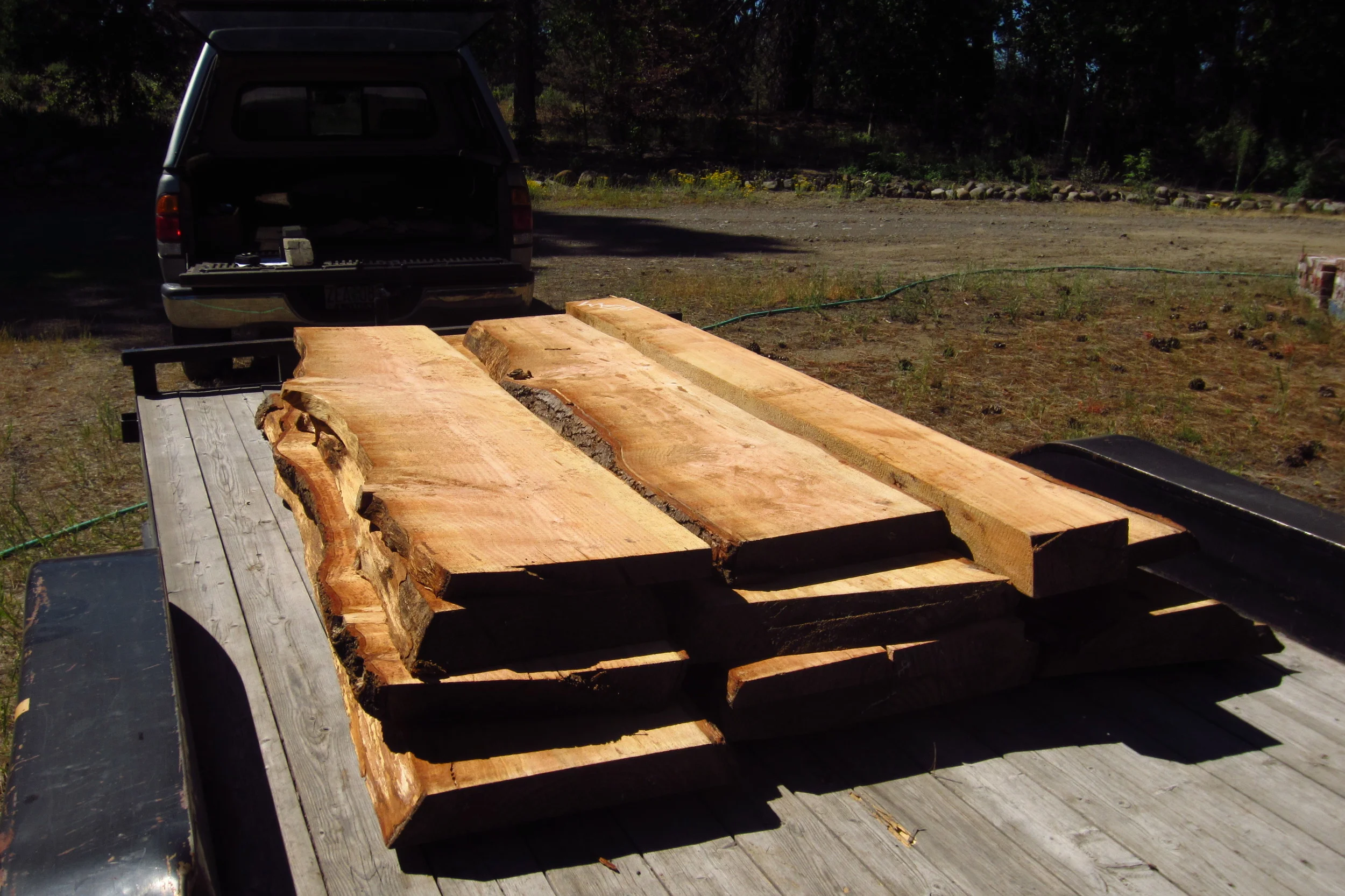 During removal of the fir, I requested that the lowest portion of the trunk be cut into two 8′ long sections. These trunk sections aged in our backyard for a year, with the bark on and the ends sealed. At 1 year, I had the logs milled locally at Urban Lumber in Springfield, OR. They then sat stickered and covered in a building in Chiloquin, OR where they dried a further 6 months.