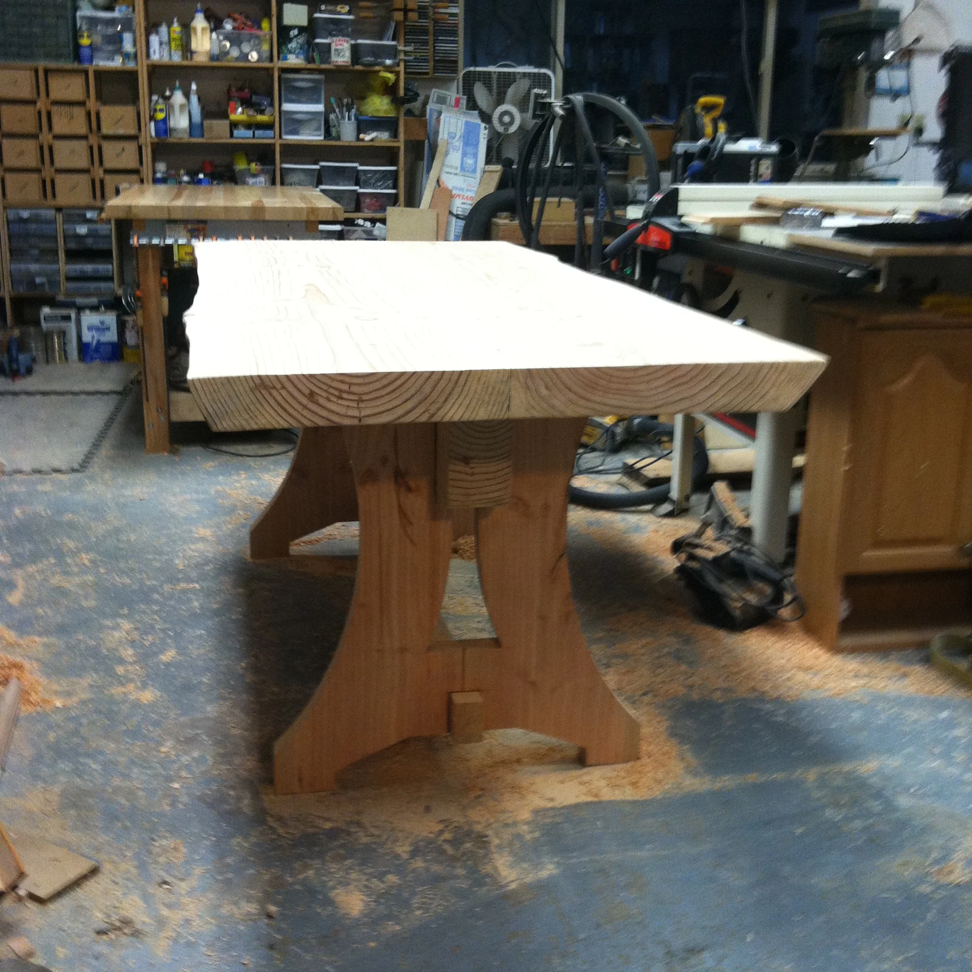 The table began its journey as a tree in our backyard. The doug-fir was competing for space and light with a large pin oak. In consultation with arborists and native plant experts, it was decided to remove the doug-fir in order to save the oak. Native plant experts determined that neither species should be considered since pin-oak is not native to Oregon and doug-fr is native to the slopes of hills and mountains, but not to valley floors. As such, the arborists pointed out that due to the nature of the fir / oak positioning, the oak had been shielding the fir from winds. Removal of the oak would have resulted in the doug-fir toppling in a heavy wind due to the loose valley dirt it grew in as well as the non-symmetrical nature of the fir branches.