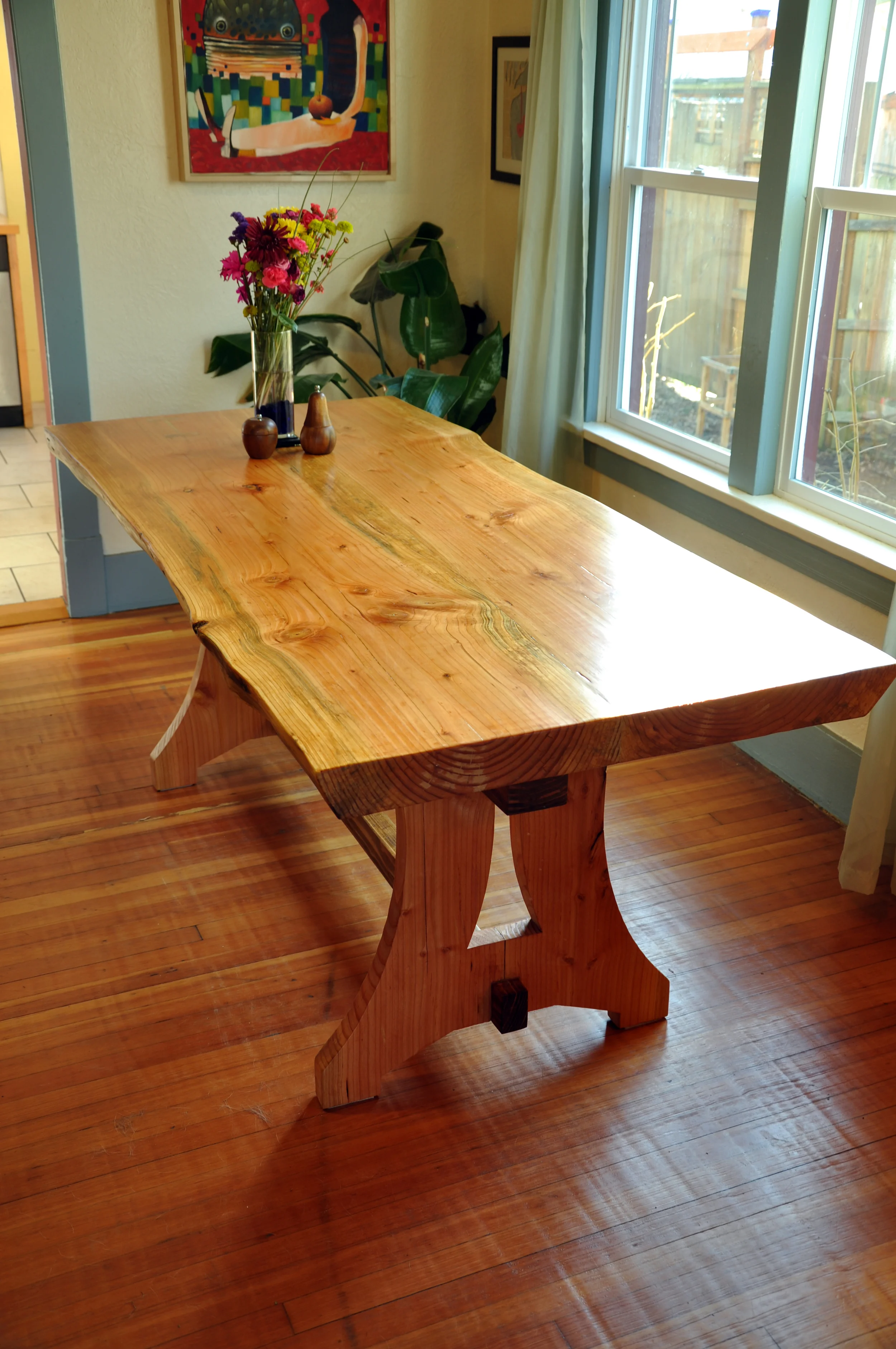 The table legs are designed with wide legs for support that taper and are hollowed in the non-structural middle to elevate and lighten the look of the heavy 3" thick top. The top is meant to withstand dancing on! Cross beam a the bottom add stability against racking and a foot rest. All wood is douglas-fir and has only been stained or treated differently for contrast and to highlight the elements.